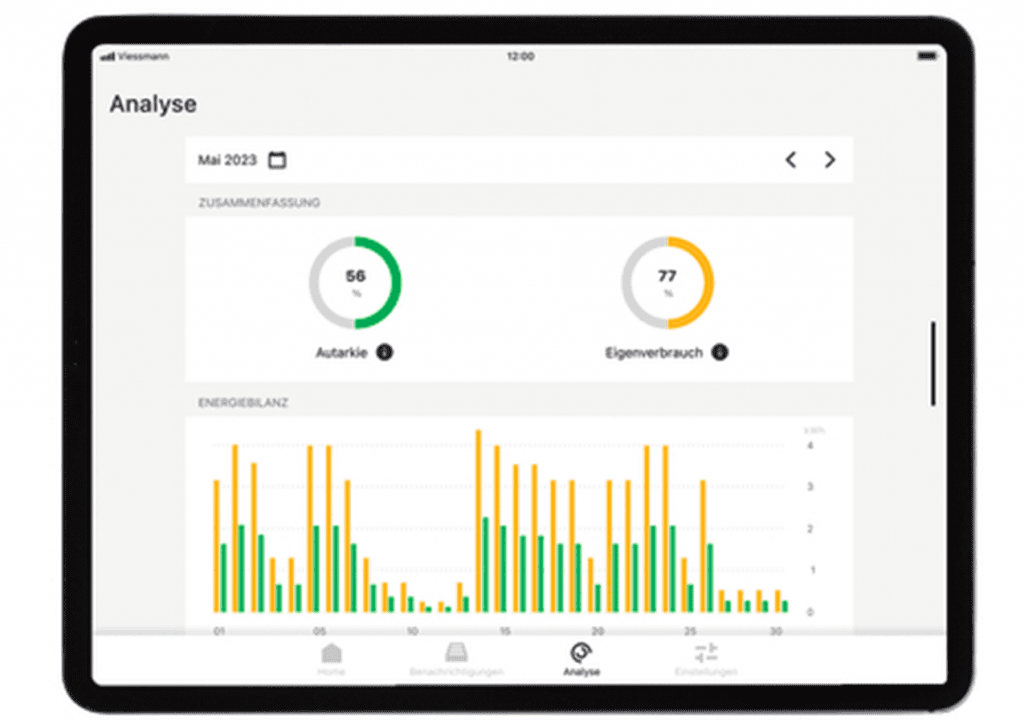 Das VICARE-ENERGIEMANAGEMENTSYSTEM von VIESSMANN bietet Ihnen nicht nur die Möglichkeit, Ihre Heizung komfortabel von unterwegs zu steuern – es ermöglicht auch die Verwaltung Ihres Stromverbrauchs und Ihrer Photovoltaikanlage. Über die benutzerfreundliche VICARE App können Sie festlegen, wann Ihr Zuhause warm werden soll, den Energieverbrauch anpassen und Ihre eigene Stromerzeugung optimal nutzen.